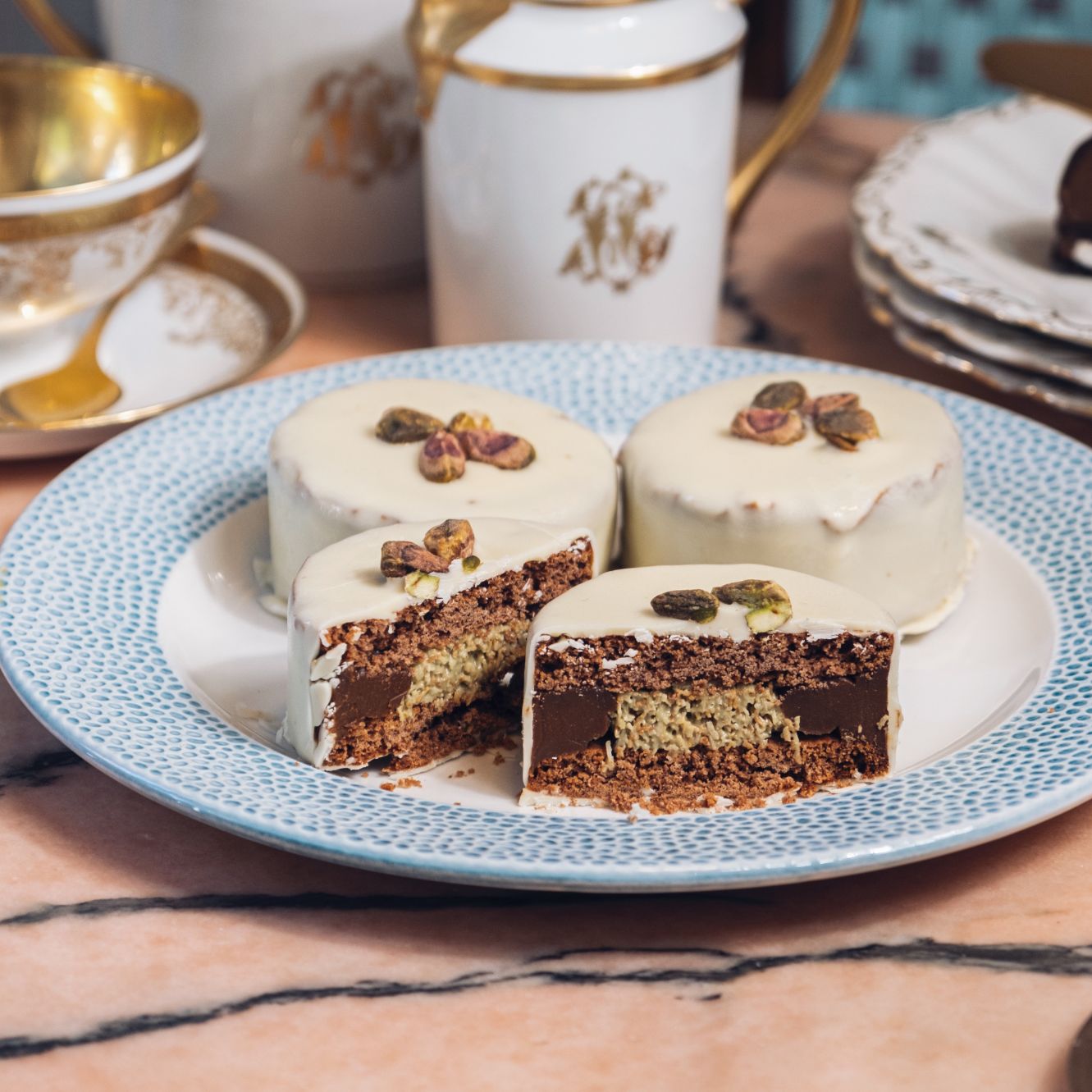 Dos galletas de cacao rellenas de crema de pistacho y kadayif y cubierta de chocolate blanco y pistachos