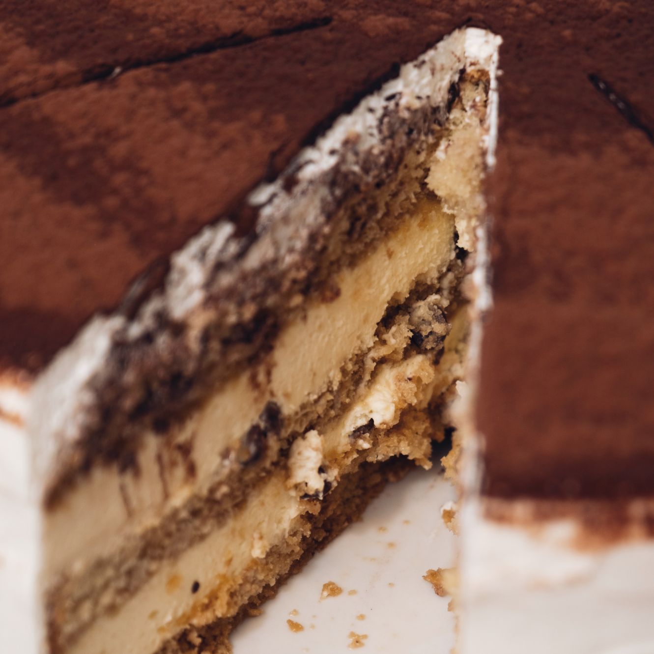 Capas de bizcocho savoiardi con café, relleno con crema de mascarpone y un toque de chocolate